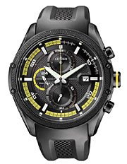 Egy teljesen más, a többitől merészen eltérő stílusirányzat jegyei fedezhetők fel a CITIZEN karórák legújabb Eco-Drive szerkezetes fényenergiát hasznosító modelljén. A nemesacélból készült óraház fekete és arany együttes színkombinációja méltóságot, eleganciát kölcsönöz, mondhatni tekintélyt sugárzó angolstílust képvisel. Az óra szögletes formájához persze remekül illeszkedik a csokoládébarna bőrszíj is, mely szavak nélkül egy új design megérkeztét hirdeti. A számlapon a 12-es szám alatt található egyedi "big date" teljesen automatikus naptár kialakítása, megjelenése és leolvashatósága kiemeli az órák tömegéből ezt a különleges modellt. CITIZEN SUPER CHRONOGRAPH Időmérés mesterfokon!